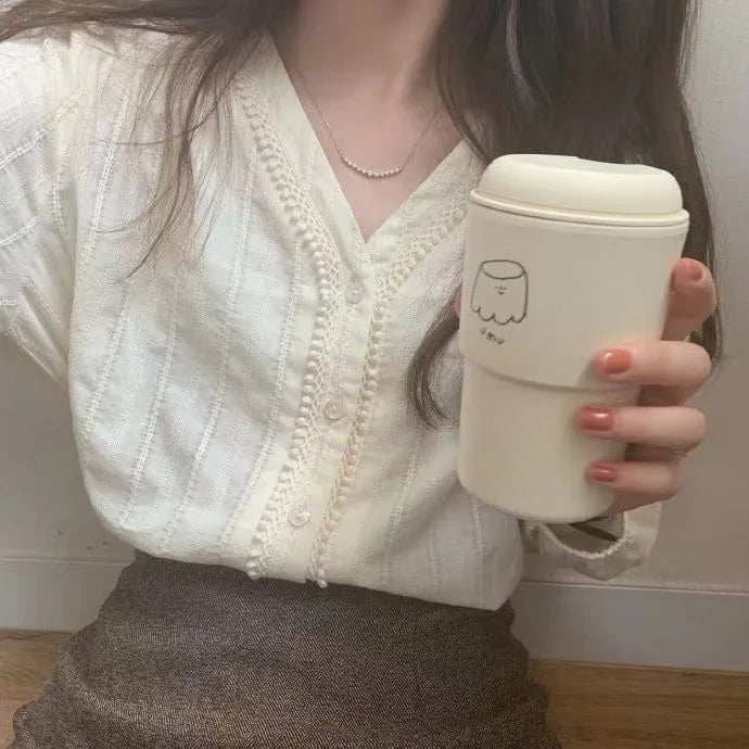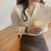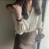 White V-Ne Lace irt Women's Loose Long Sve Thin Spring Autumn Korean Sle Versatile Top Design Sensation Small ence