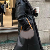 Faux Fur Leather Long Jacket Women Lapel Long Sleeve Belt Thicken Female Coats Winter Fashion Street Patchwork Lady Outwear