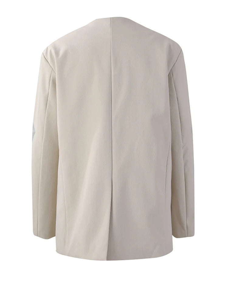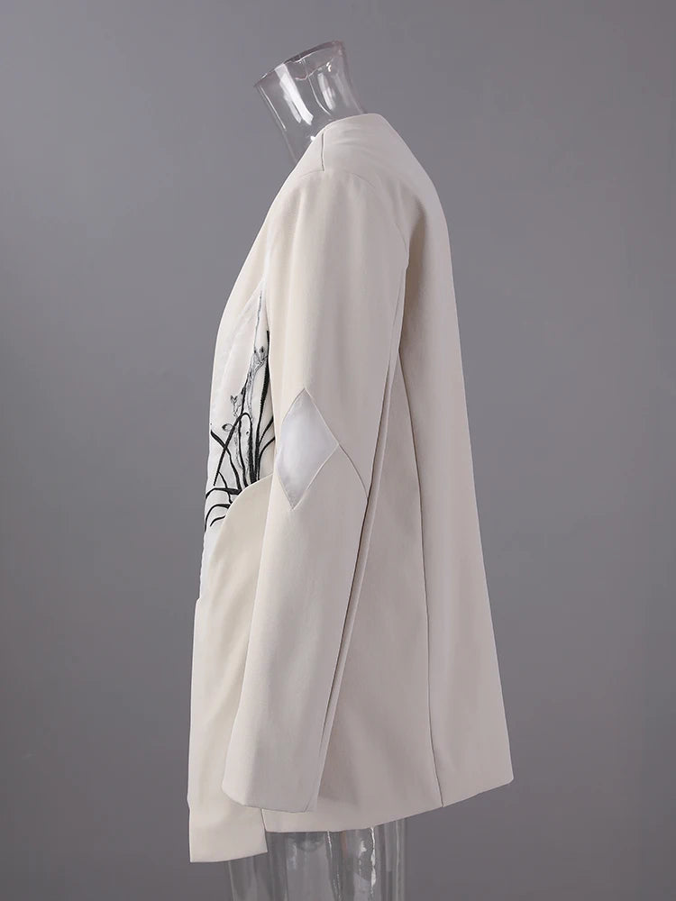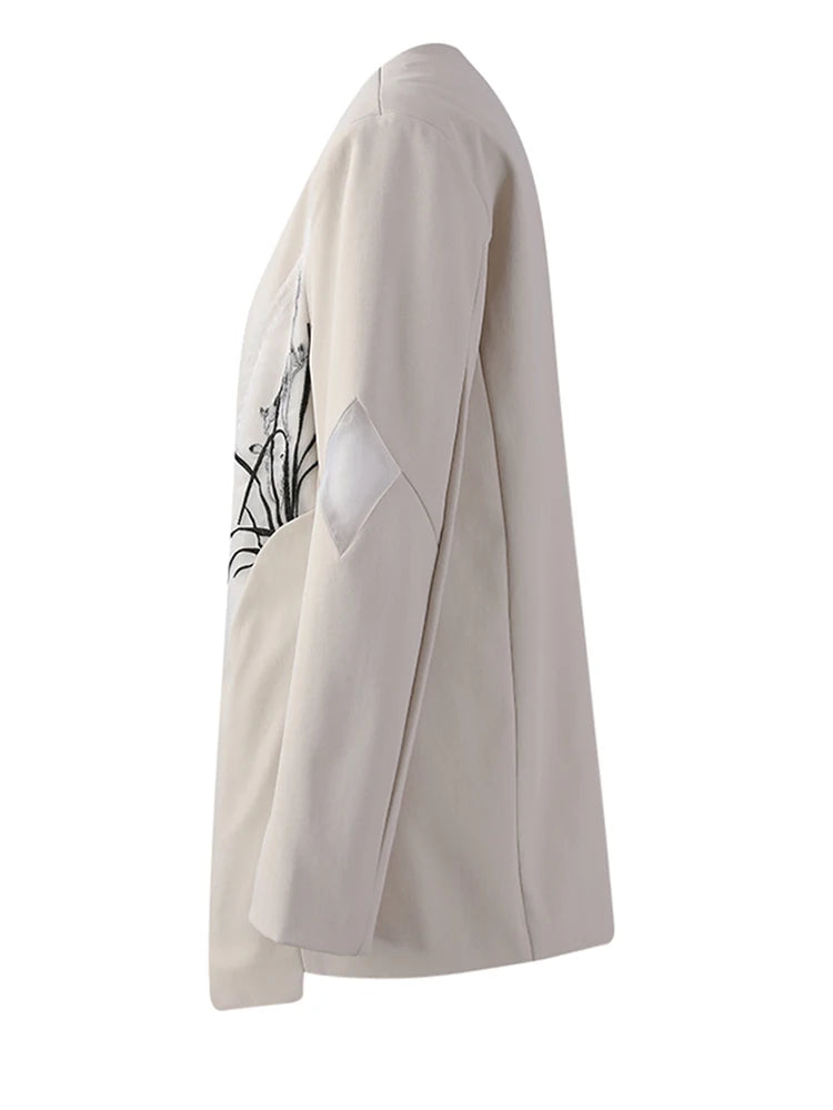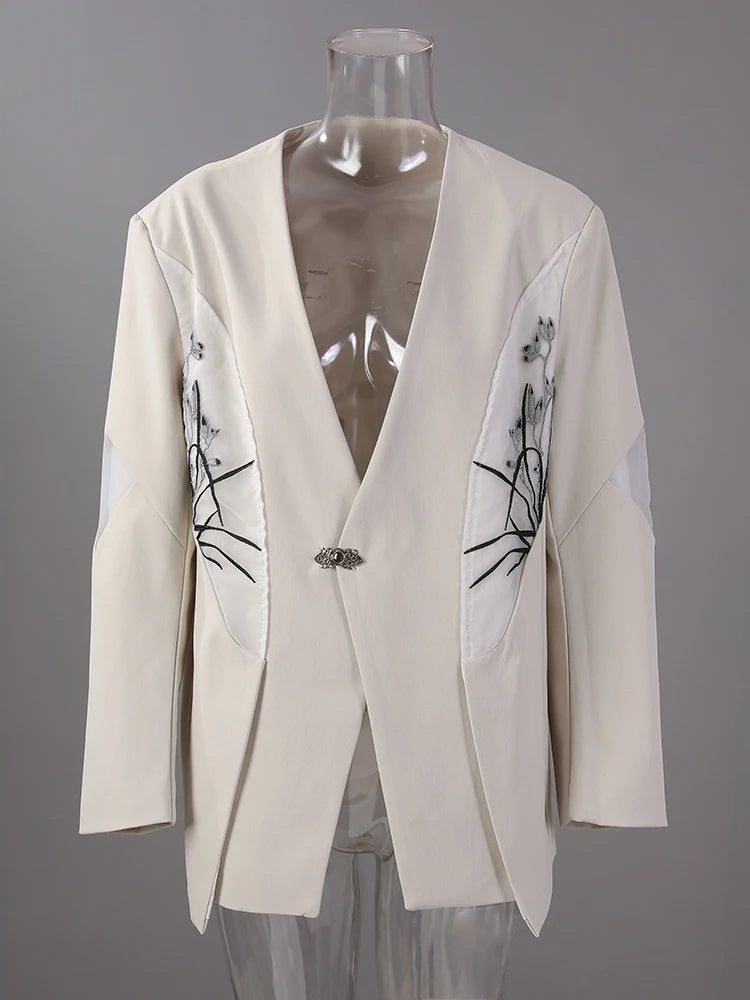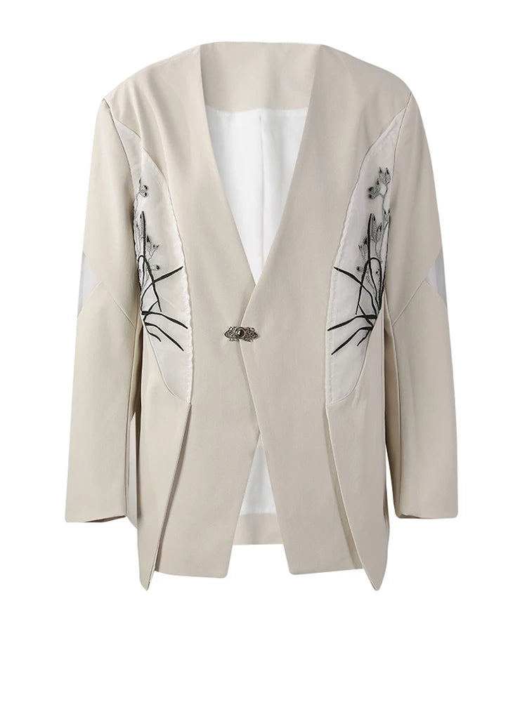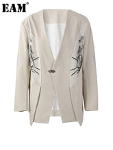 [EAM] Women Beige Embroidery Big Size Elegant Blazer New V-neck Long Sleeve Jacket Fashion Tide Spring Autumn 2025 CPG2975