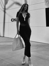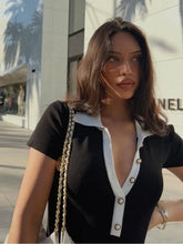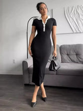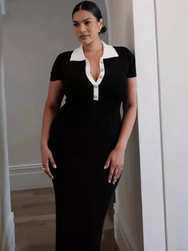 Elegant Knit Maxi Dress for Women Short Sleeve Patchwork Party Dresses Fashion Lapel Single-breasted Slim Knitwear Women's Dress