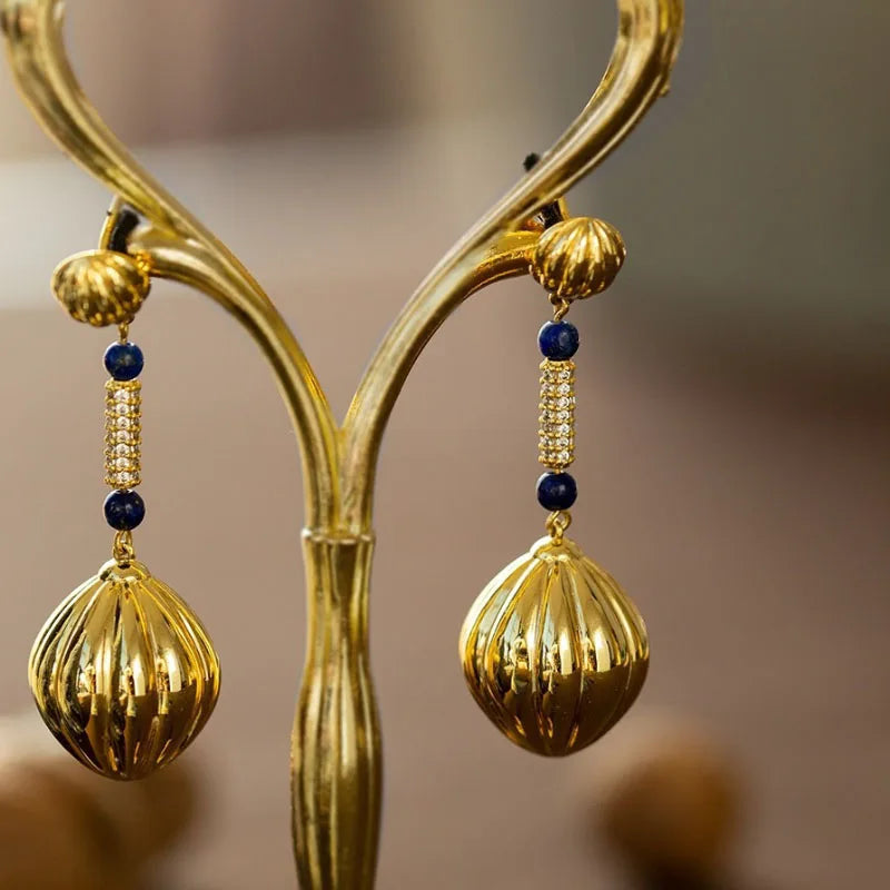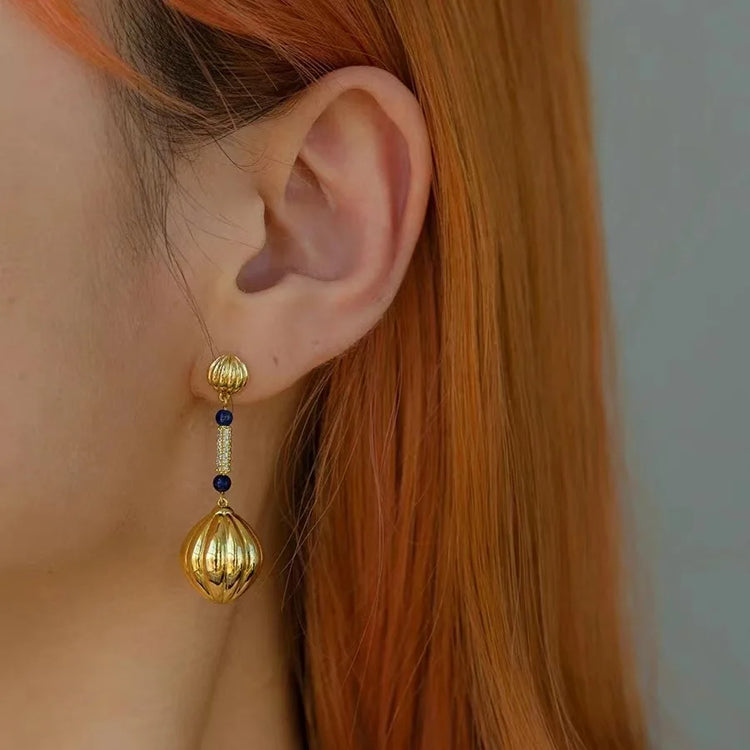 Original design Retro lapis lazuli earrings for women classic Laziness antique gold crafts glossy round beads earings jewelry