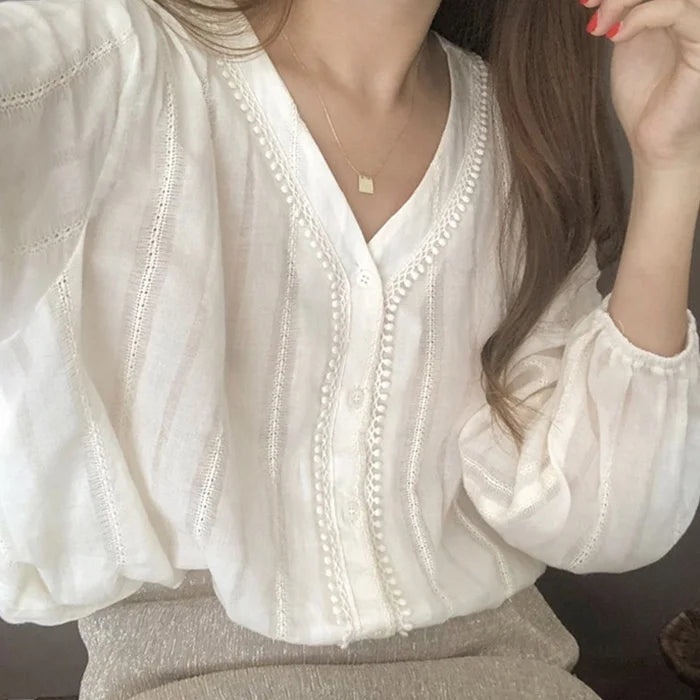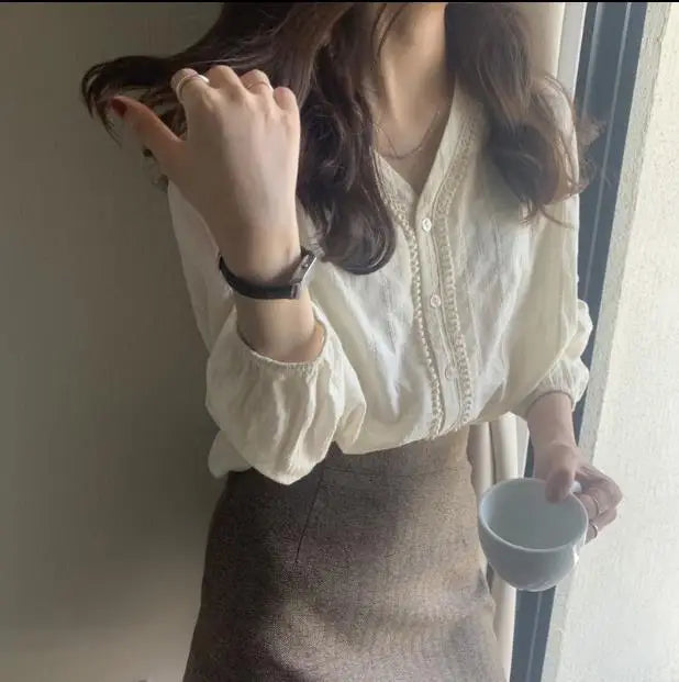 White V-Ne Lace irt Women's Loose Long Sve Thin Spring Autumn Korean Sle Versatile Top Design Sensation Small ence